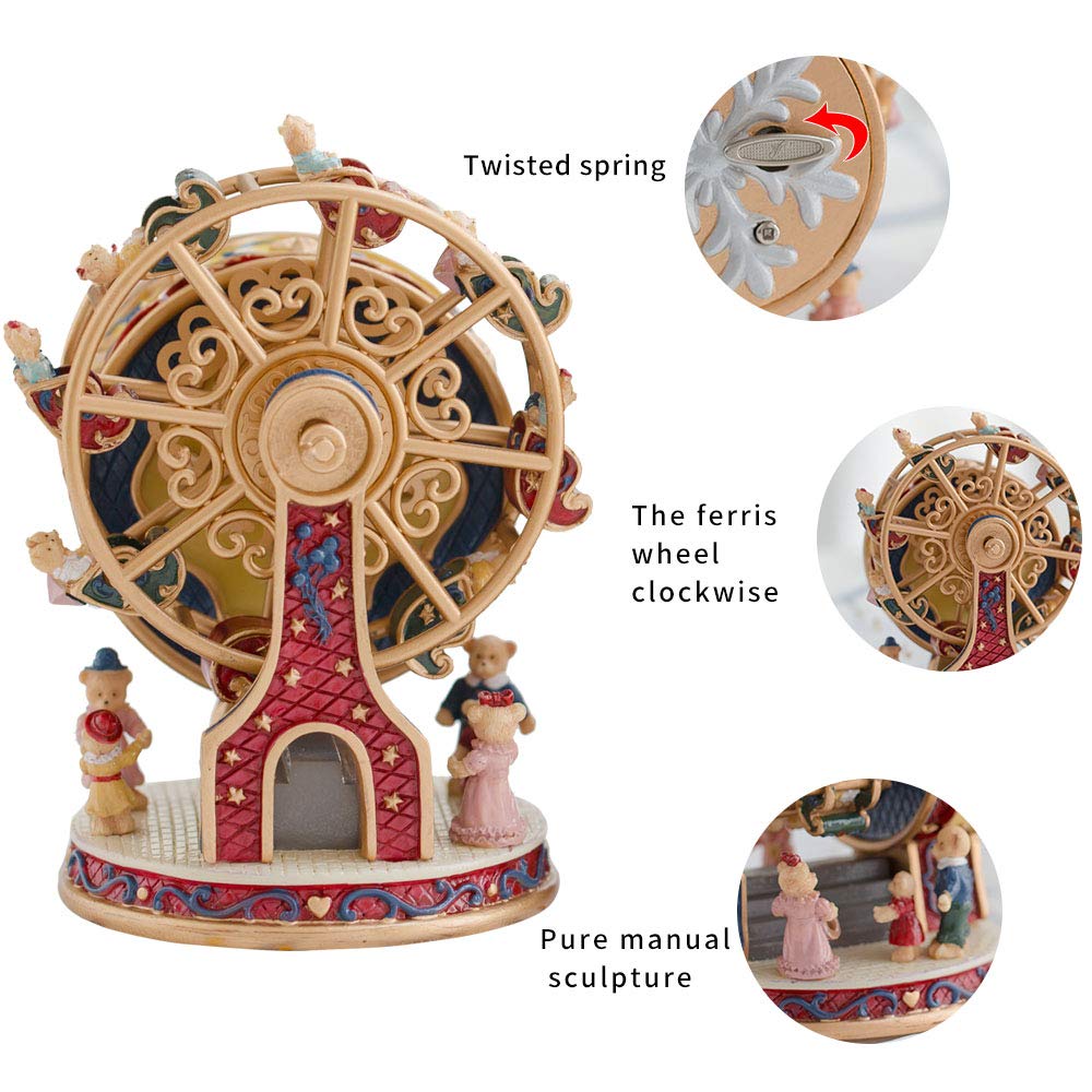 • Mechanical Marvel: At the heart of the music box is a finely tuned mechanism that, when wound, propels the Ferris wheel to rotate gracefully, accompanied by a delightful melody that captures the essence of joy and nostalgia.
