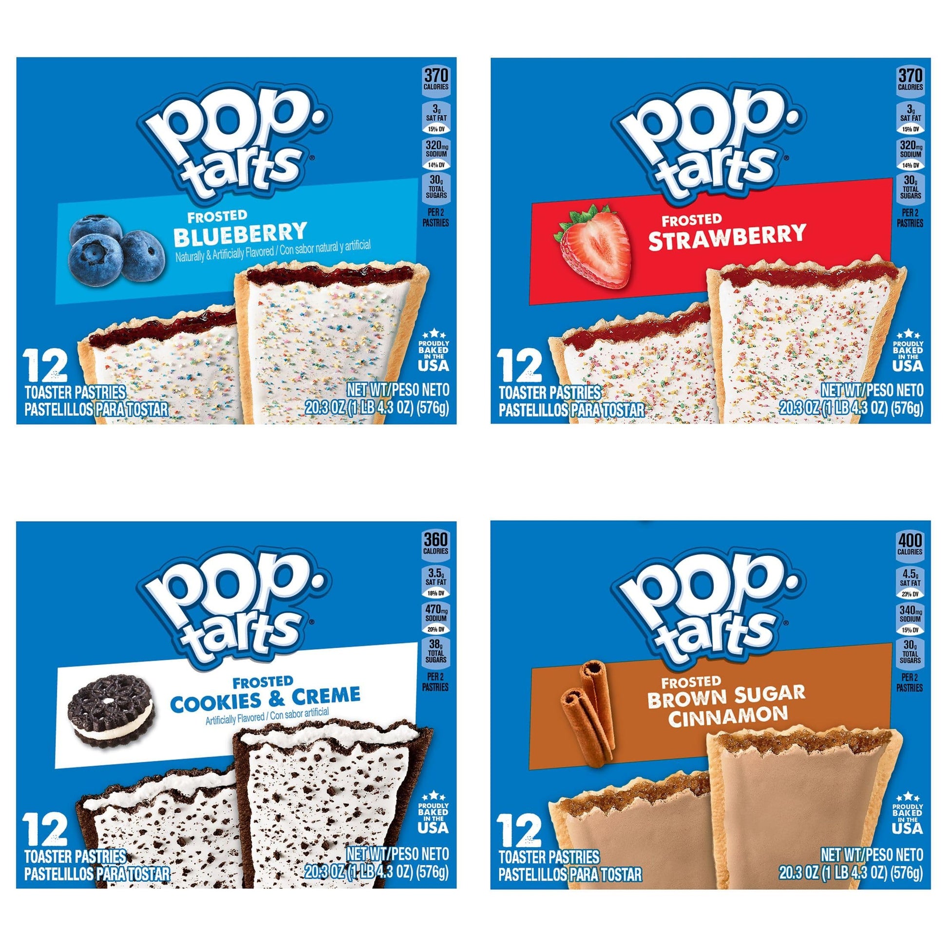 Details: Pop-Tarts toaster pastries are the perfect sweet treat at breakfast, for a lunch snack or dessert. Featuring sweet Frosted Strawberry, Frosted Blueberry, Frosted Brown Sugar Cinnamon, and Frosted Cookies and Creme flavors, this variety pack is perfect for kids snacks and adult snacks on the go. Pack Pop-Tarts in kids lunchboxes for school snacks, or stock the office pantry with this individually wrapped grab and go adult snacks. Pop them in the toaster and pair with milk, create your own ice cream sandwiches, or incorporate into your favorite dessert recipe for a sweet treat. These irresistible snacks for adults and kids provide a good source of three B vitamins. Stock your pantry with these shelf stable snacks and enjoy ready to eat treats anytime. Includes five boxes containing 24 Frosted Strawberry, 12 Frosted Blueberry, 12 Frosted Brown Sugar Cinnamon, and 12 Frosted Cookies and Creme Pop-Tarts.