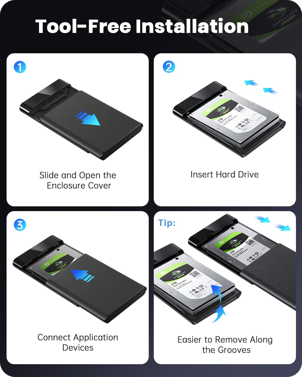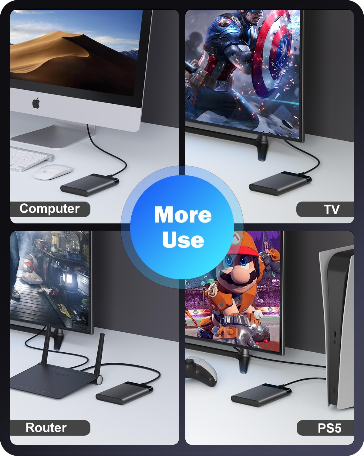 • Universal Compatibility: This external ssd/hdd enclosure is designed for 2.5 inch 7mm/9.5mm SATA hard drive and SSD up to 4TB. Compatible with Windows, Linux and Mac OS and above and compatible with Western Digital, Toshiba, Samsung, Kingston, Crucial, Hitachi hard drives, etc. Widely used in PC, Laptop, Xbox, PS5/PS4/PS3, Router and so on. (Also backward compatible with USB 2.0 or 1.1)