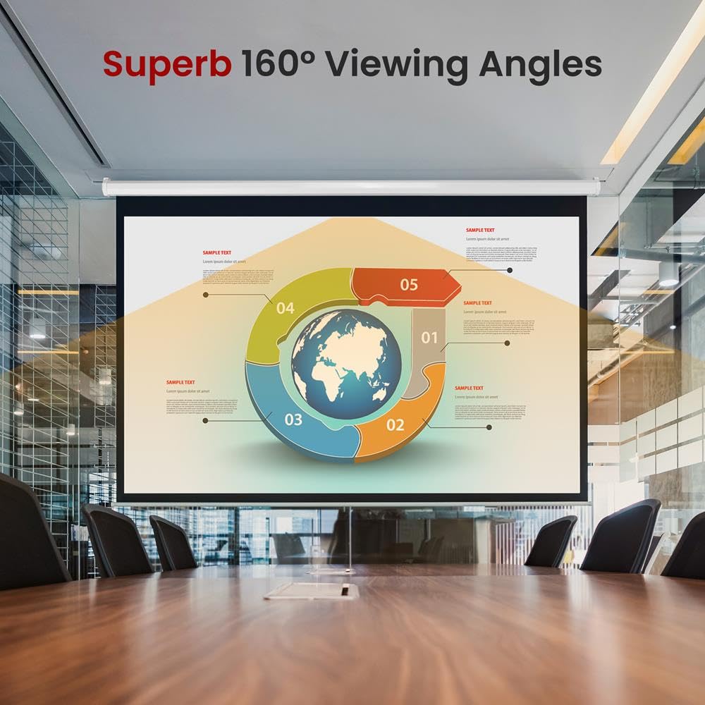 • MATTE WHITE SURFACE: The matte white fabric & black border frame of the video screen pull-down hanging projector screen creates impeccable color balance to project a realistic picture & deliver ultra-wide off-axis viewing making every seat the best one