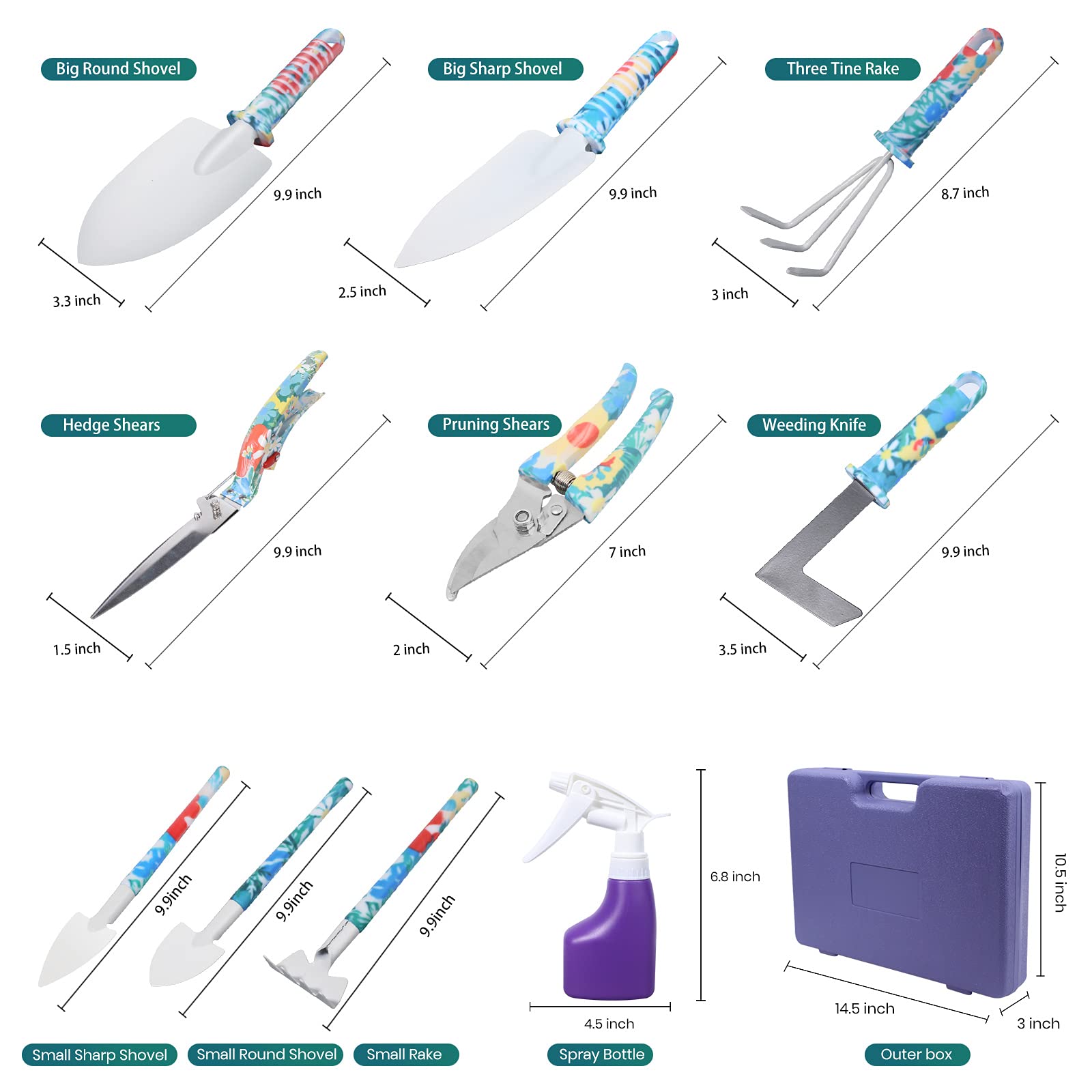 • Unique Design & Multifunctional: Improved iron heads, no paint loss. Plastic molding water sprayer. Rubber handles printed with floral patterns. Lightweight makes gardening easier and more enjoyable. Perfect for a variety of tasks including digging, weeding, raking, loosening soil, aerating, transplanting, pruning, and watering to meet all your requirements for indoor and outdoor gardening