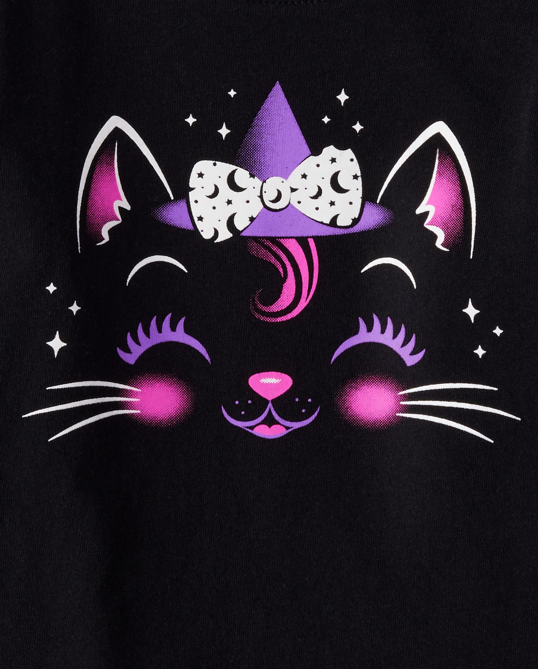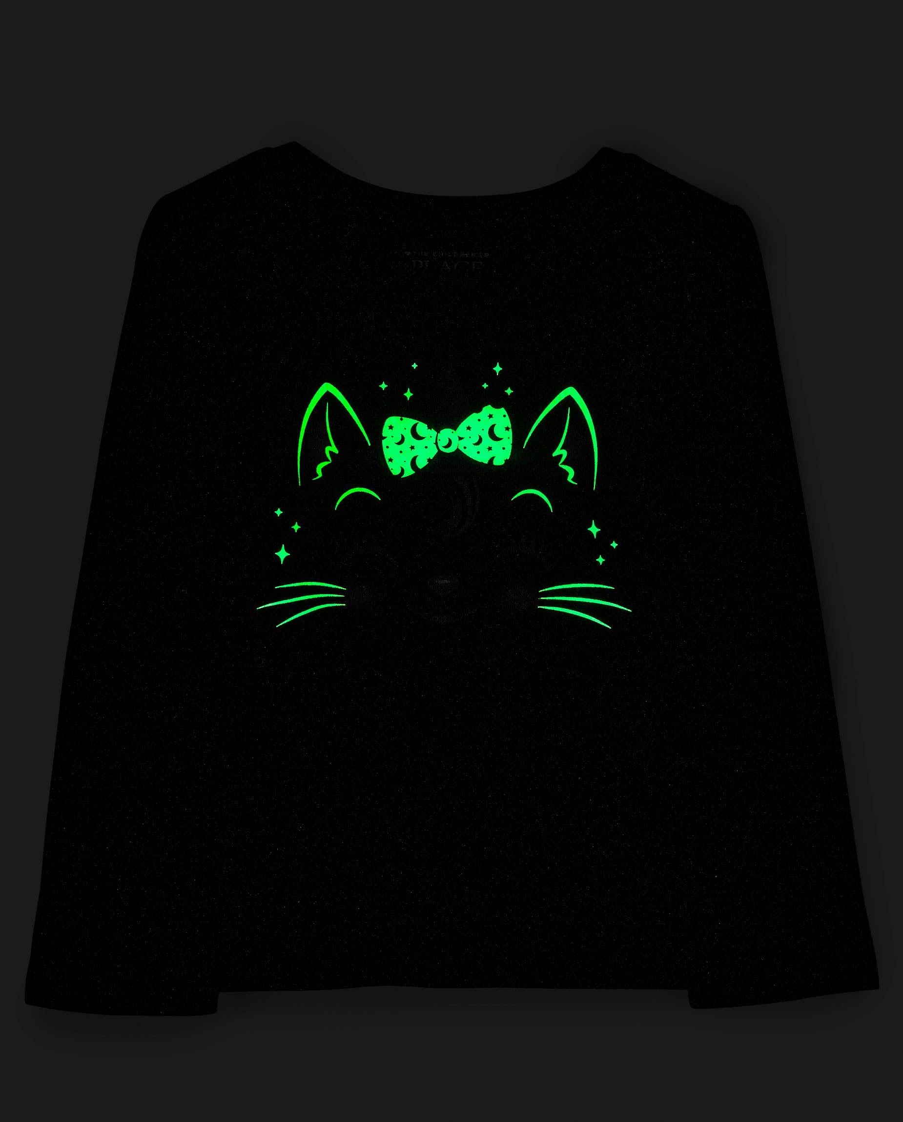 • MULTIPACK: 1 glow-in-the-dark cat with witch hat & bow graphic design, 1 glow-in-the-dark Halloween doodle graphic design; for best glow effect, expose to light before wearing