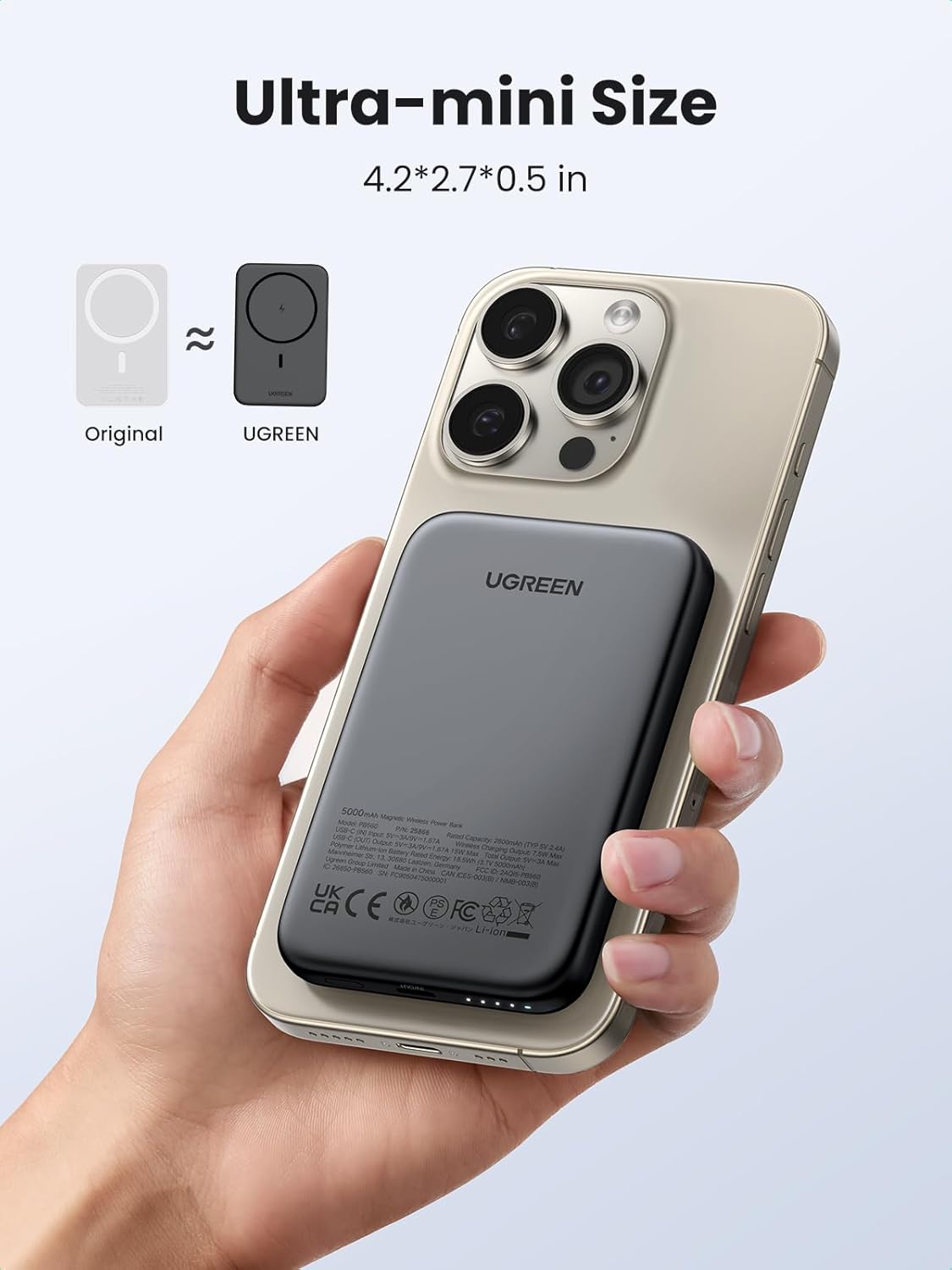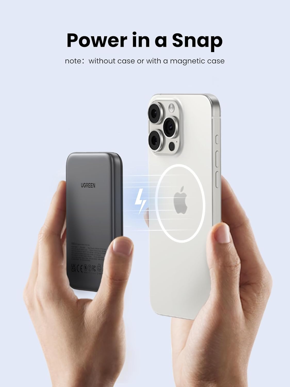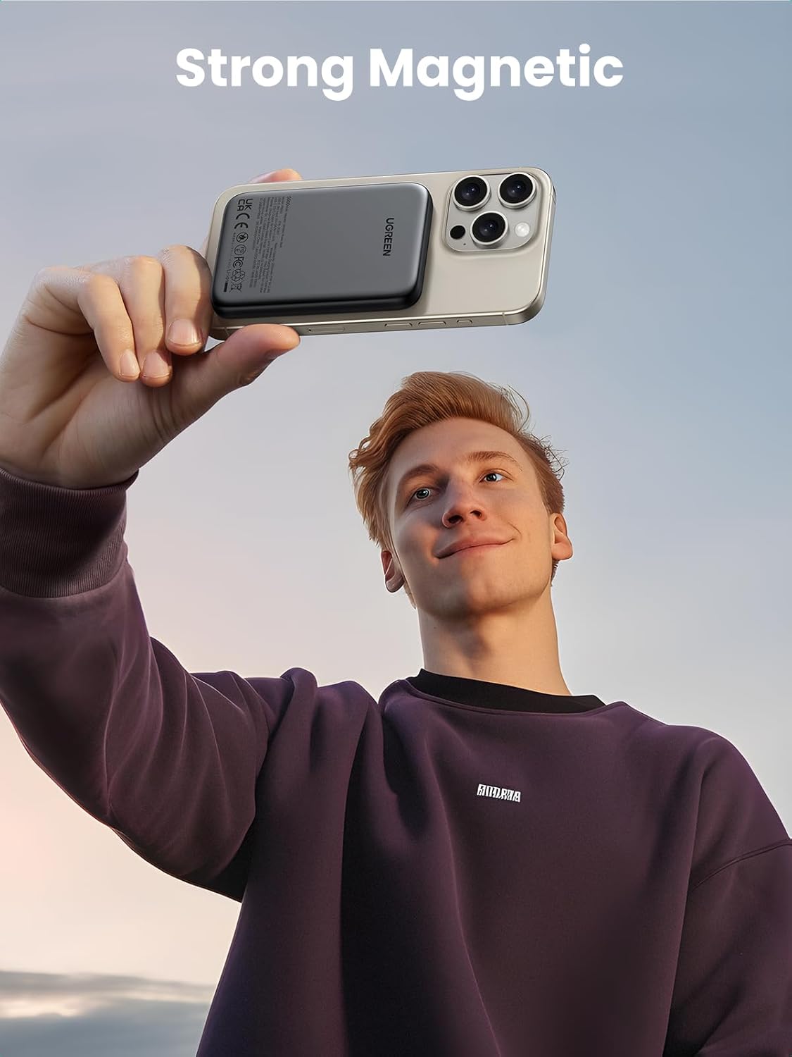 • Perfect for iPhone 17-12 Series:This UGREEN magsafe power bank features a strong built-in magnet that snaps securely to your iPhone, delivering stable wireless charging without slipping. Enjoy the convenience of a magsafe charger for streaming, gaming, or making video calls anytime, anywhere.