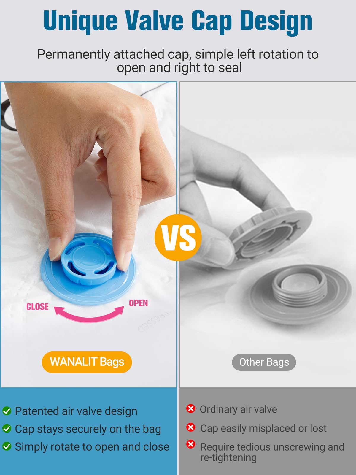 • 【Unique Valve Cap Design】Our innovative valve cap design sets us apart from other vacuum bags. Unlike standard valve caps that require tedious unscrewing before pumping and re-tightening afterward - not to mention being easily misplaced. our revolutionary design features a permanently attached cap that stays securely on the bag. With simple left rotation to open for pumping and right rotation to seal after use, this hassle-free mechanism eliminates the need for removal while ensuring you'll never lose the cap