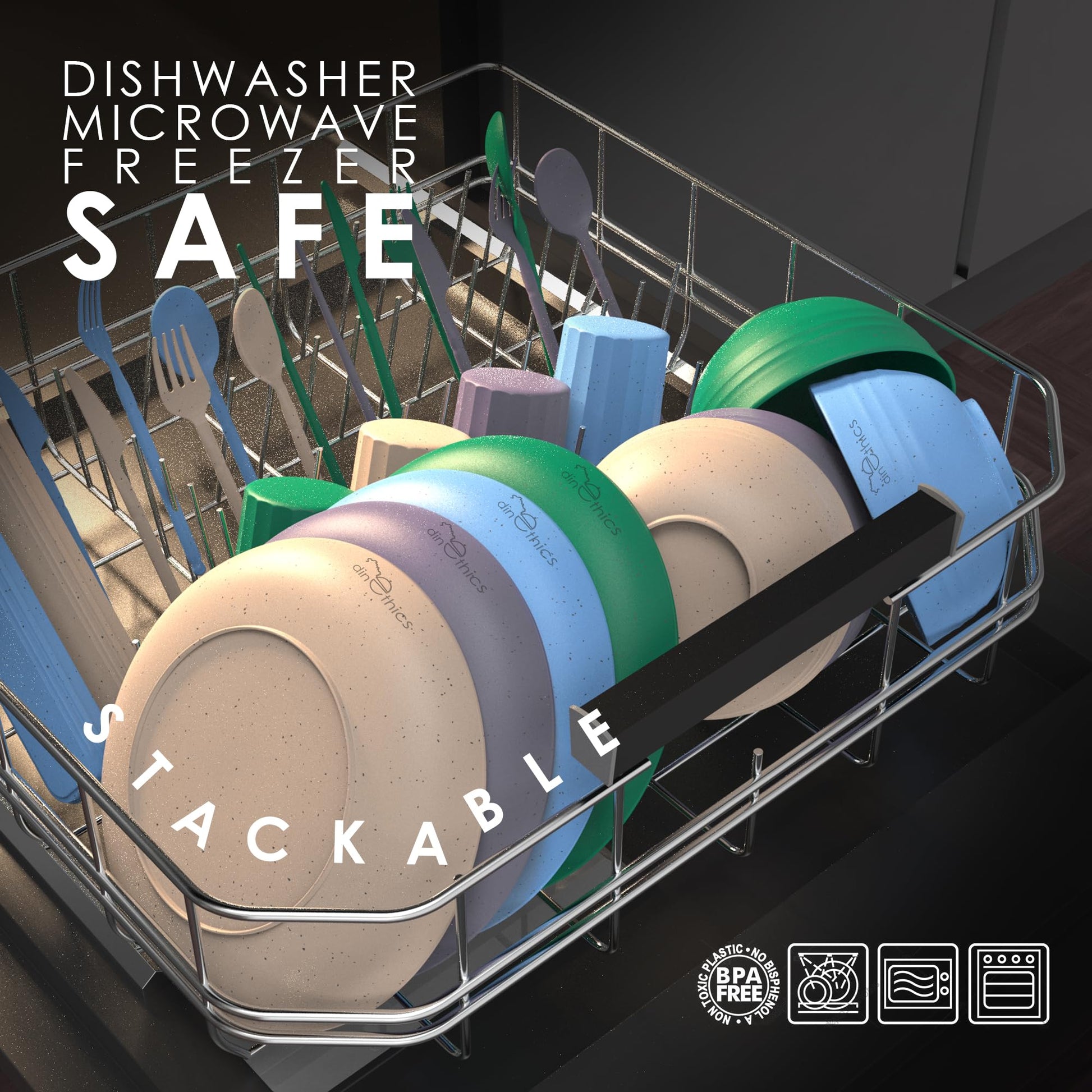 • STACKABLE & NON STAINABLE : Our Lightweight Dinnerware Set Is A Healthy Alternative To Plastic Dishes Set. The Dorm Kitchen Essentials aka Rv Dinnerware Sets Are Stain Resistant & Travel Friendly!