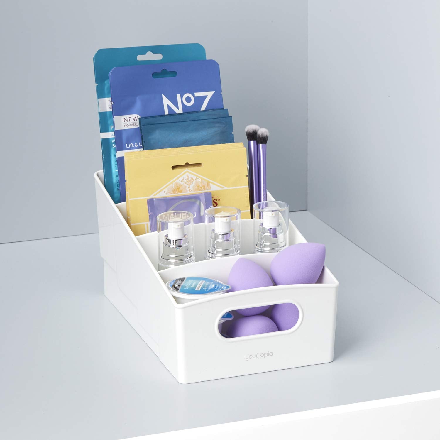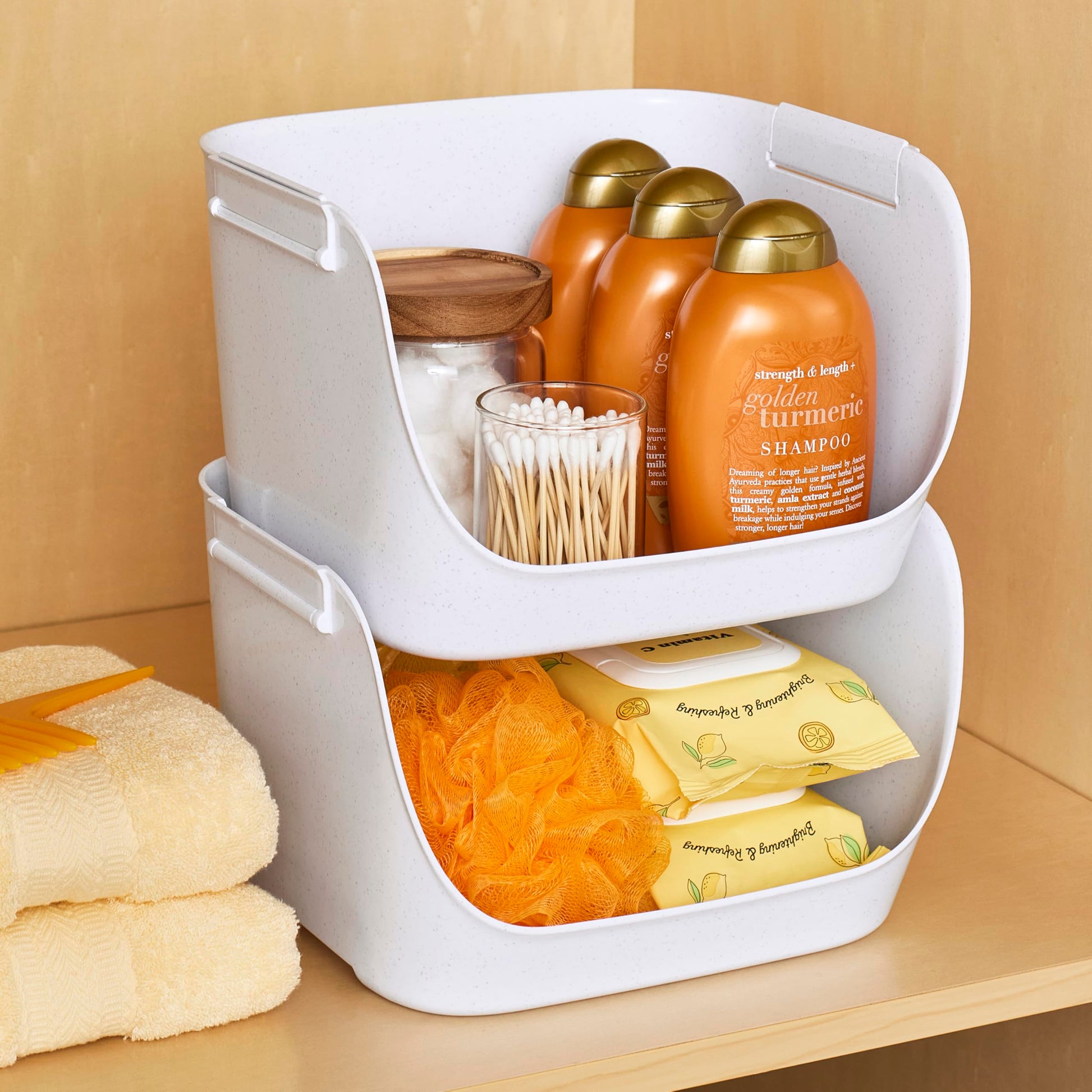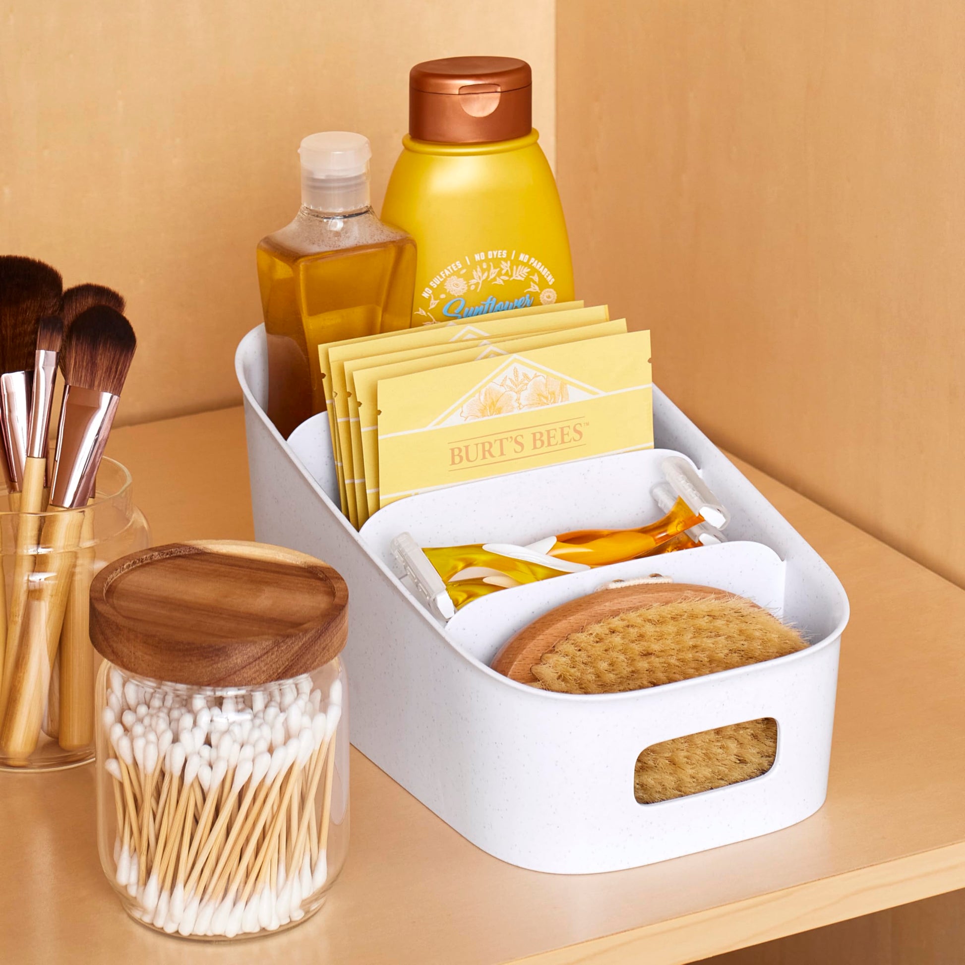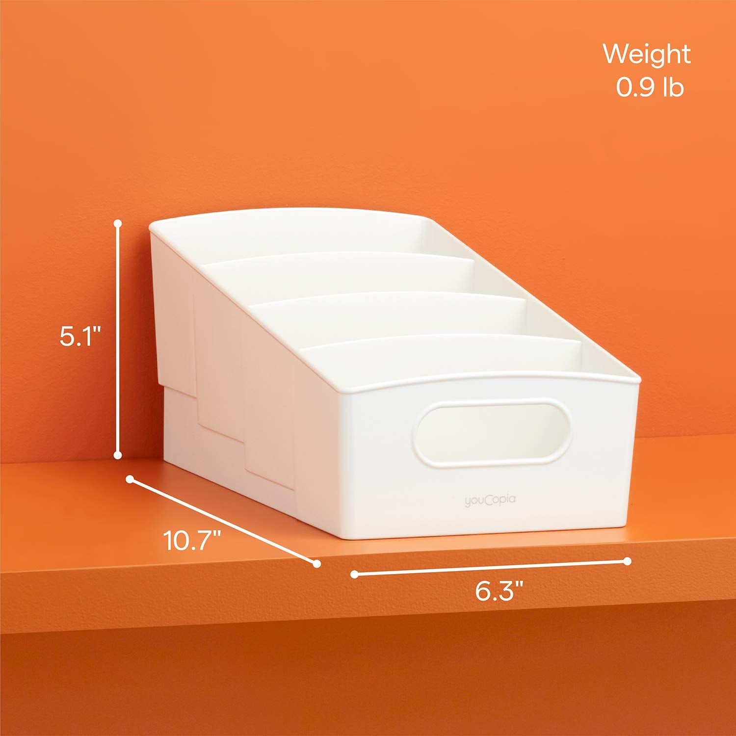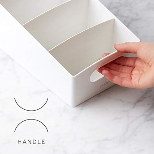 Steps up your pantry game. ShelfBin™ Packet Organizer scores points with four compartments to stash small things - snacks, packets, seasonings and more - in a cabinet or pantry. A tiered design keeps items on display at different heights so you can always reach the back row. The built-in handle makes it easy to carry the bin to a counter for selection and refills (so you can recycle original packaging). It plays well in the kitchen, office, craft space and bathroom too! With a bin this tidy, your organization will feel next-level.